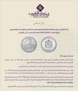 ووفقًا لبلاغ صادر عن البنك توصل موقع دنا بريس بنسخة منه، فإن هذه القطعة تُخلد الذكرى الخامسة والعشرين لتربع الملك محمد السادس على عرش أسلافه.